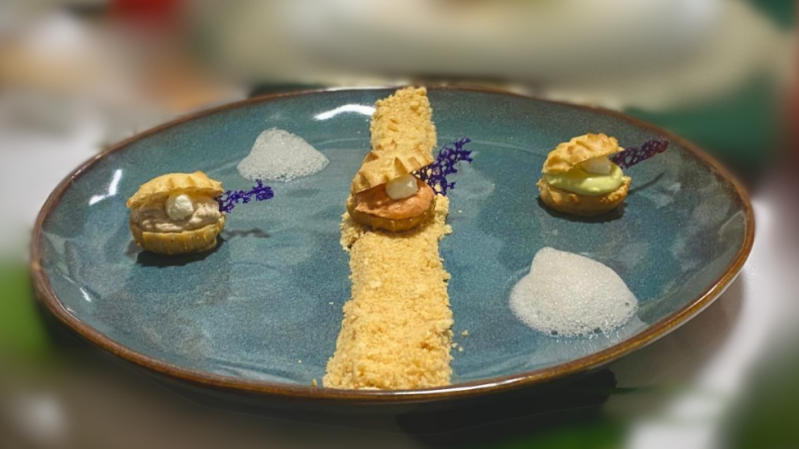 • Se sirve junto a una pasta Choux elaborada en forma de concha, la cual se rellena con una variedad de mousses, como mousse de marlín ahumado, mousse de aguacate con pichas regionales y mousse de almendra.